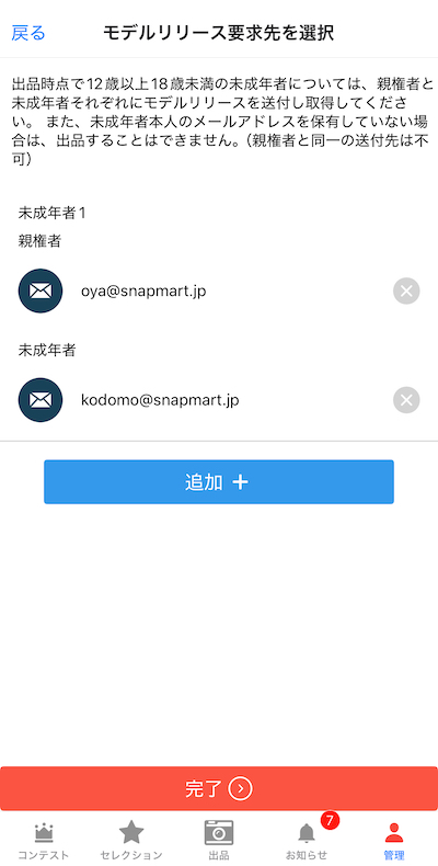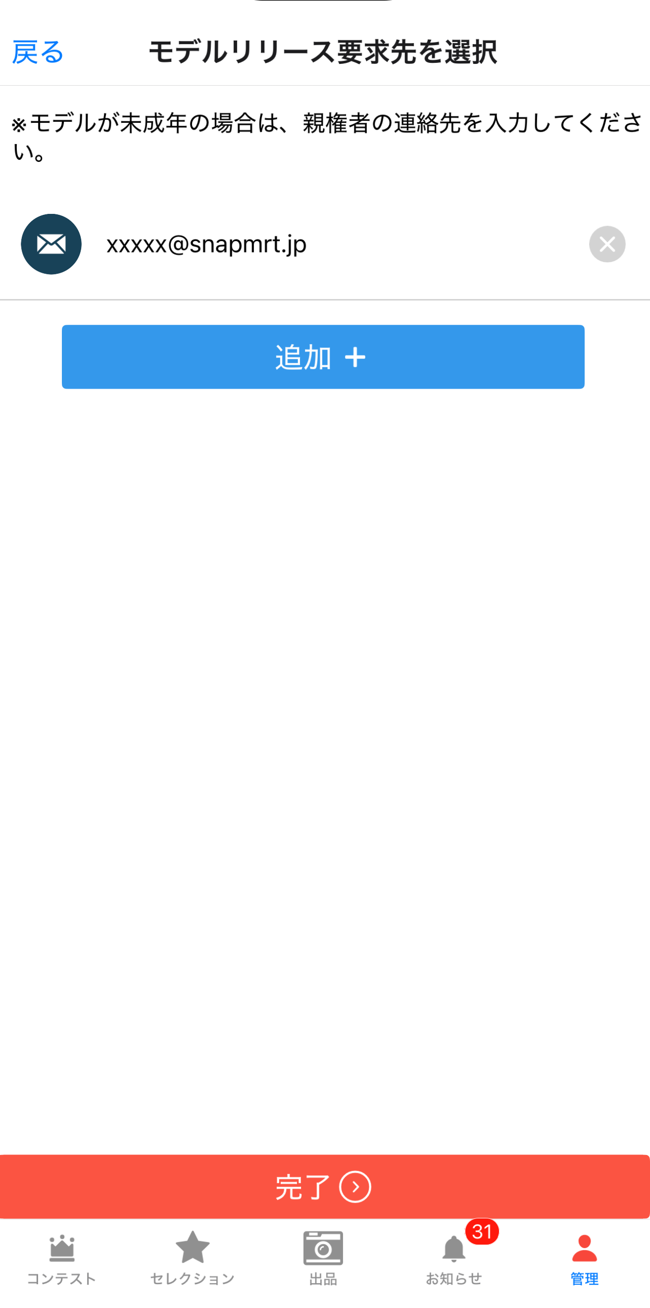メールアドレスを入力もしくは、アドレス帳から選択(「知人」のみSnapmartユーザーから選択も可) いずれかの方法で、モデルリリース送信先を必要な人数分すべて登録し、最後に「完了」をタップする